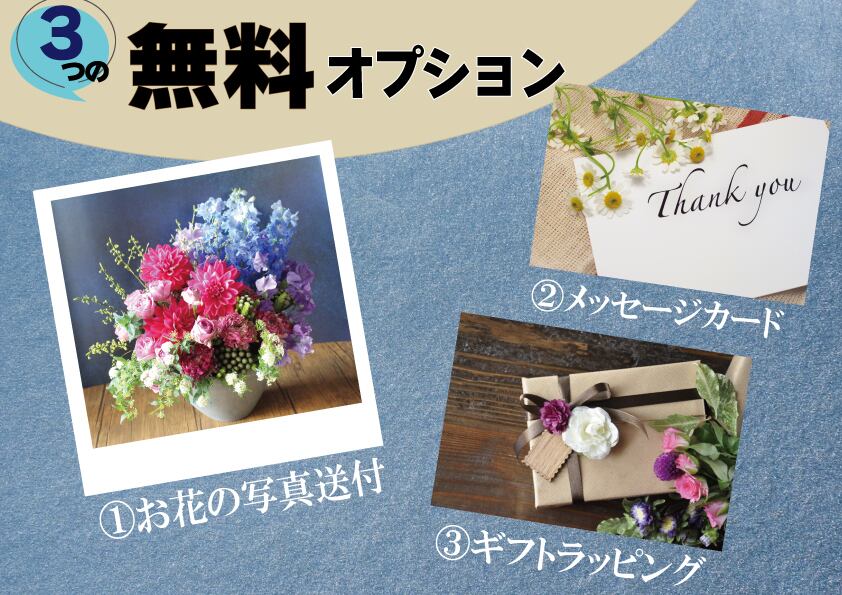 お花や立て札等のオプションに破損・誤字脱字・手違い等がございましたら、すみやかにお取り替えいたします。