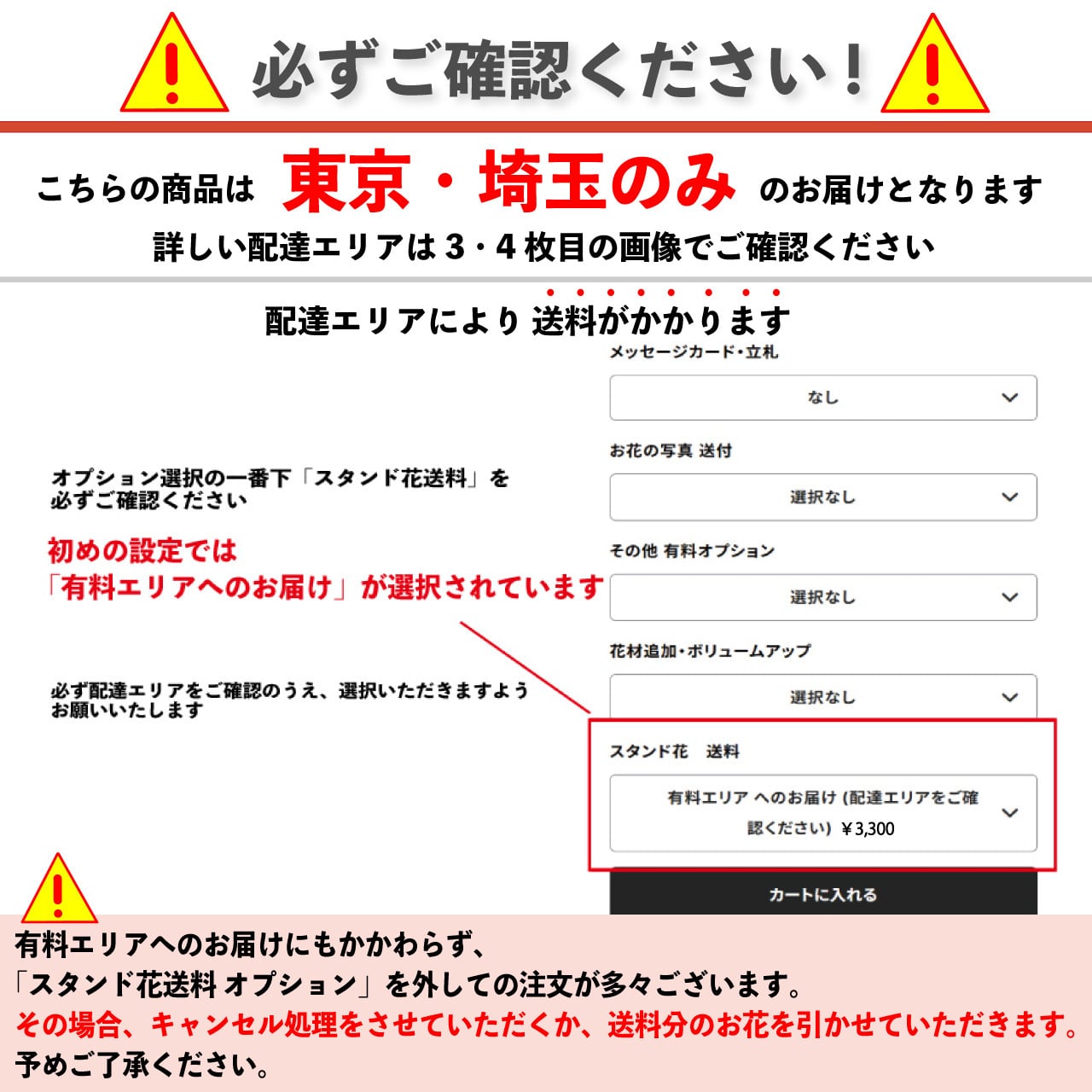 「有料エリア」にかかわらず「スタンド花送料」が選択されていない場合はキャンセル扱いとなりますので、ご注意ください。